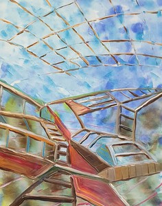 2024Voortgaan naar een onzekere toekomst, sept'24. Ik heb bijna wekelijks op mijn schilderochtend een schilderij gemaakt wat direct het gevoel van dat moment weergaf. Van angst naar verdriet, van vertrouwen naar vertwijfeling, de kapotgeslagen droom en de zachte landing aan het einde van de tunnel. De schilderijen verbeelden sterker dan de woorden emotie en gevoel kunnen beschrijven. Dit schilderij heeft als titel 'klauteren onder dreiging'
